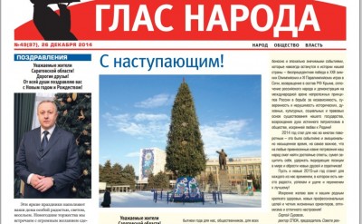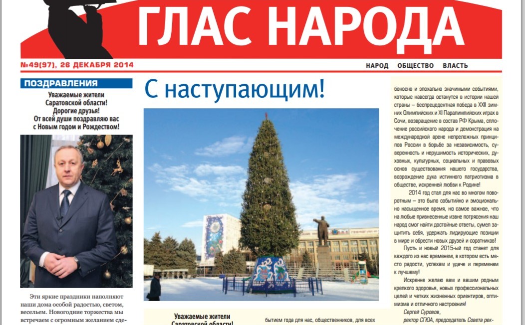 Вышел в свет номер 49 еженедельника Общественной палаты "Глас народа"от 26 декабря 2014 г. Напоминаем, что газета распространяется с помощью общественных распространителей в вузах и других учреждениях Саратова. Ее можно получить в Общественной палате, а также приобрести в киосках Роспечати и на Почте России. С электронной версией всех номеров нашей газеты можно ознакомиться на сайте Общественной палаты на странице с архивом номеров газеты.
