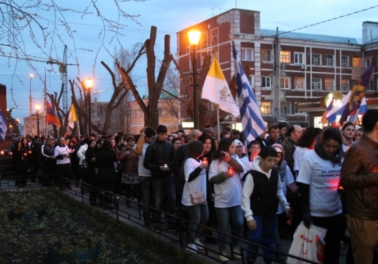 Многочисленный народ в количестве 400 человек со свечами прошли от памятника «Хачкар», расположенного на сквере улицы Октябрьская в центре Саратова до православного храма иконы Божией Матери «Утоли моя печали» и площади имени Н.Г. Чернышевского.